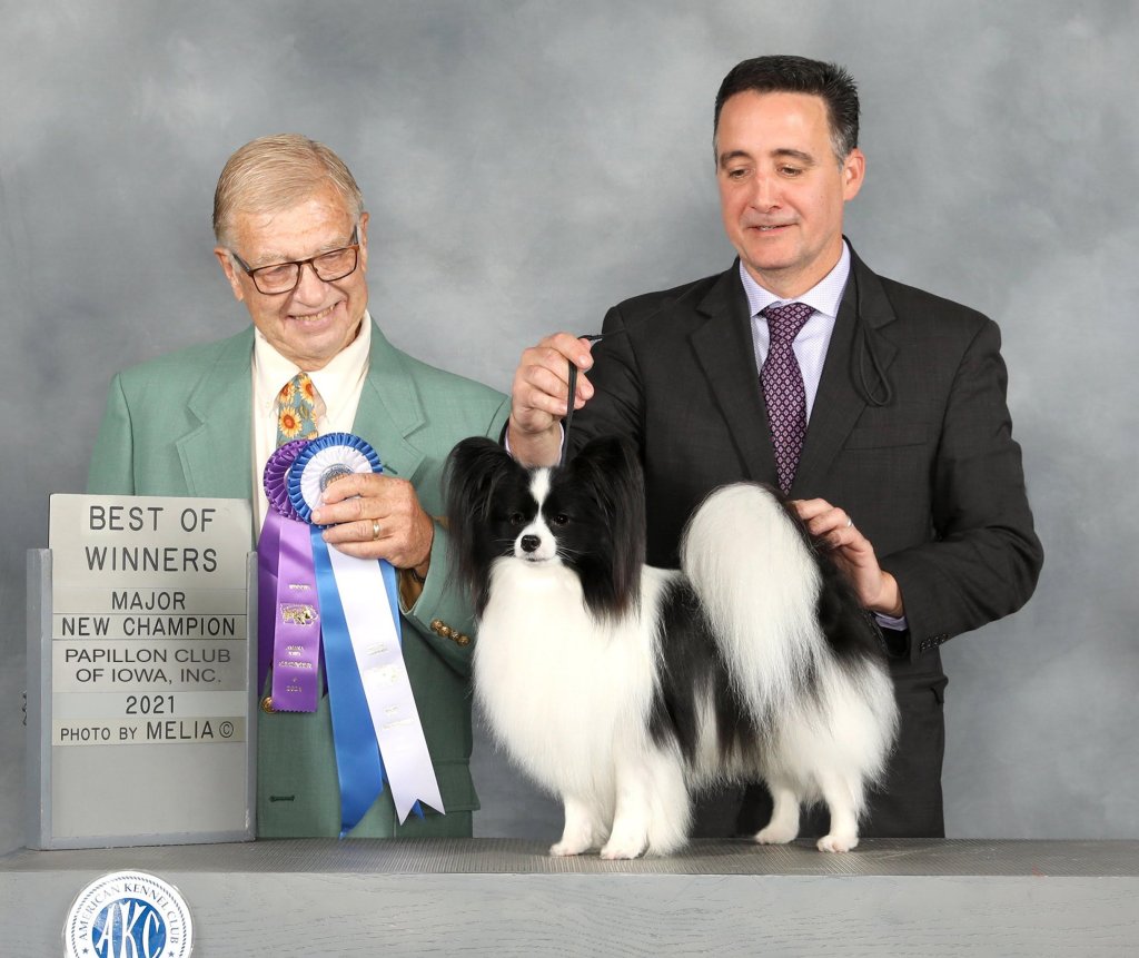 JJJ wins two more five point majors to finish his AKC Championship at the Papillon Club of Iowa Specialty, handled by Brian Livingston.